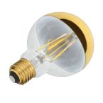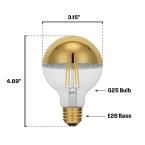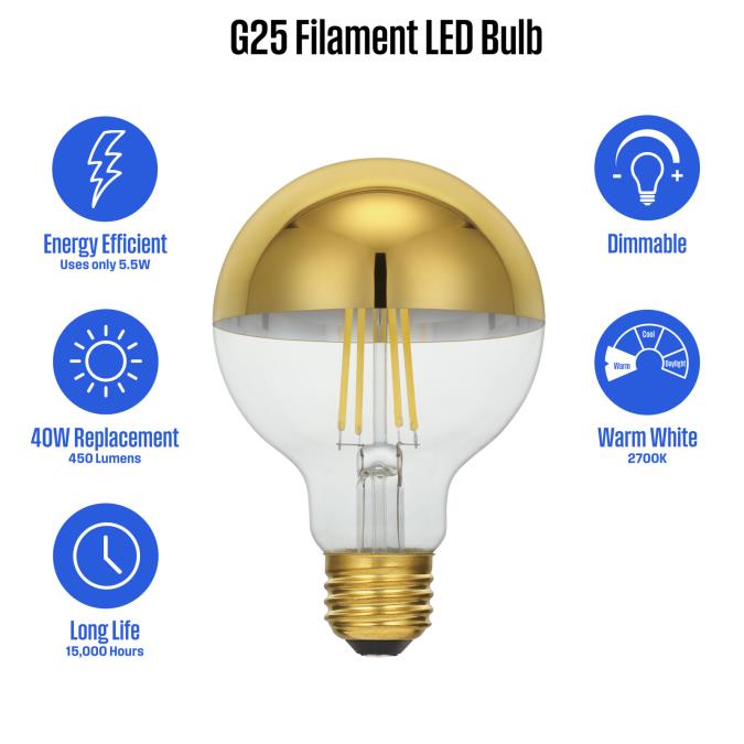 VERSATILE USE: Perfect for various environments, including indoor, outdoor, and wet areas, and ideal for enclosed fixtures like Hollywood strips and bath bars.DISTINCTIVE DESIGN: Features a vintage style with a visible filament and an elegant half-gold finish.ENERGY-SAVING: Built to last with a long lifespan, minimizing maintenance and ensuring long-term performance.ADJUSTABLE LIGHTING: Equipped with dimmable features, allowing you to tailor the lighting to your liking at any time.PRODUCT DETAILS: Uses 5.5 Watts of power, equivalent to 40 Watts, and emits 600 Lumens of warm light at 2700K with an E26 medium base.