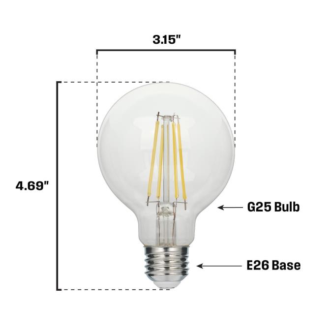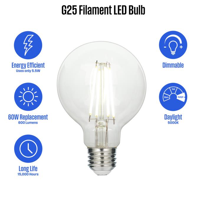 MULTIPLE LOCATIONS: Ideal for various settings, including indoor and outdoor spaces, wet areas, and enclosed fixtures such as Hollywood strips, bath bars, and large pendants.CLASSIC STYLE: Features a vintage design with a visible filament, perfect for adding a classic flair to both modern and retro styles.ENERGY-SAVING: Provides efficiency with a long lifespan, reducing maintenance and ensuring consistent performance.CUSTOMIZABLE: Equipped with dimmable features, allowing you to adjust the lighting level to your preference at any time.SPECIFICATIONS: Includes 5.5 Watts power usage, equivalent to 60 Watts, delivering 600 Lumens at 5000K with an E26 medium base.