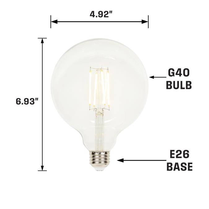 Energy-saving G40 LED filament light bulbs are an excellent replacement for incandescent globe light bulbs. Soft white light enhances the decorative ambiance of lighting, adding a unique touch to vintage-style fixtures and pendant lights. Suitable for use in enclosed fixtures and damp locations to replace less efficient outdoor light bulbs in outdoor-rated lanterns.