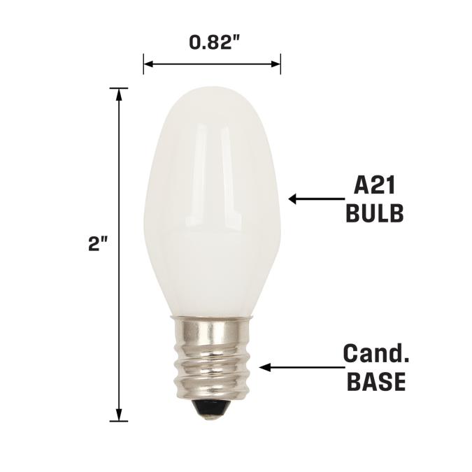 The energy-efficient clear C7 LED bulb is the perfect upgrade for traditional incandescent C7 night light bulbs. The 2700K color temperature creates a soft white glow, perfect for nightlights, decorative window candles, enclosed fixtures, and damp-rated areas such as outdoor lighting. With a low energy use of 0.4 watts, the C7 LED emits the same brightness level as a 4-watt incandescent bulb, providing long-lasting performance and reduced energy consumption.