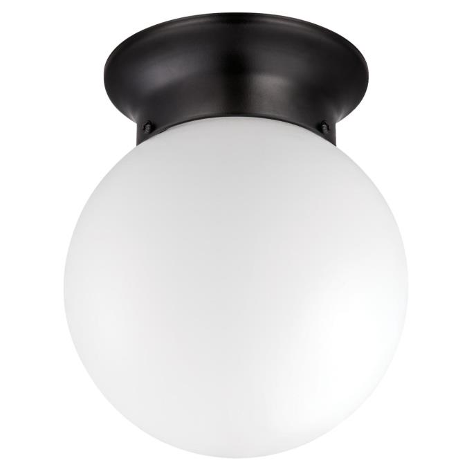 Simplicity embodied, this flush-mount fixture will add a subtle contemporary accent to your exterior space. The ceiling fixture will also provide bright light, which emanates from the large round white glass globe that is anchored by a sleek, gently curved black base.