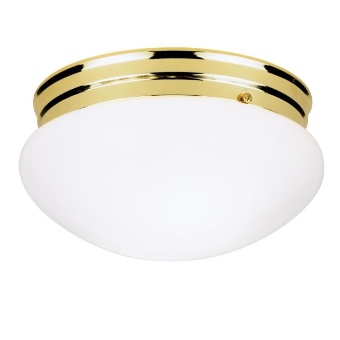 Adeptly combining a traditional mushroom glass shape with contemporary tones, this transitional two-light flush-mount interior ceiling fixture is provides diffuse light and a sleek look. A lustrous polished brass finish complements the white glass.