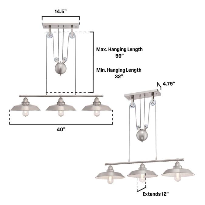 Three-light indoor pendant, adjustable pulley cord, installation instructions and mounting hardware.